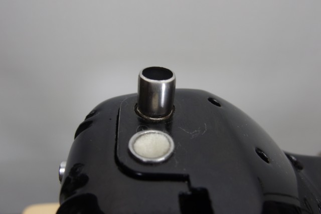 革縫いでは、押えの強さが大切で、押えが不十分で革が浮いたりすると、縫い目が飛んでしまいます。そこで、押え圧を調整するための筒ネジを外し、既存のバネの上にステンレスのパイプを入れます。パイプは、筒ネジを外すと上から挿入できるサイズで、長さ10ミリを標準にします。