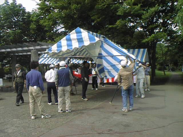 5月11日(土)、花祭りの準備をしました。テントやパラソルなどを町からお借りして、会長宅の車庫に運びました。メイン会場となる中央藤棚の上には、手作りの看板を掲げ準備完了。