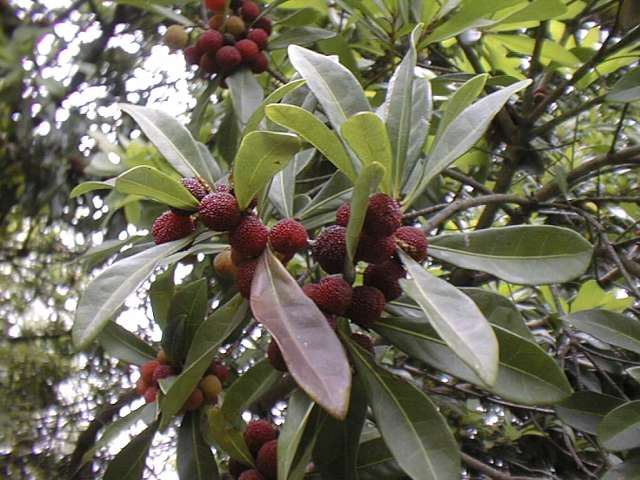 山桃と書きます。ヤマモモ科の常緑樹です。暖かい地方に自生していて、高さが10メートルを超えることもあるそうです。雄株と雌株があって、実がなるのは雌株だけです。直径1センチほどの小さな実ですが、赤く熟した実はとても甘く、焼酎やウオッカに漬けると、綺麗な赤色の果実酒ができます。