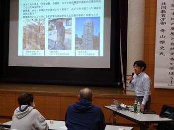講演では、あちこちに残る天変地異の痕跡から土地の履歴や過去の災害を知る必要性や、群馬県やみどり市は自然災害が少なく安全なのか、みどり市で起こった過去の自然災害、自然災害伝承が伝える災害の教訓と災害リスクの説明がありました。