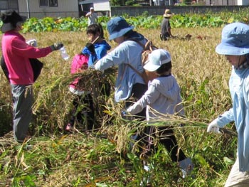 空は晴れて日差しは強く、吹く風もないこの日、強い日差しで参加者は疲れ、稲刈りの作業ははかどらずに、作業は予定をオーバーして正午になっても終わりませんでした。