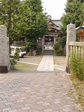側面道路から斜路と石段で数m下がって社地にはいります。
