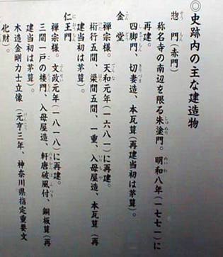 ←■稱名寺の説明 (正面の赤門は『惣門』というのだ!) 日本建築の屋根の形 は切妻造(きりづまづくり)、入母屋造(いりもやづくり)、 寄棟造(よせむねづくり)、宝形造(ほうぎょうづくり)があって、 稱名寺の場合、惣門は切妻造、金堂と仁王門は入母屋造ですね。 ■ 金沢文庫(パンフレットより) 北条氏の一族(金沢北条氏)の北条実時が武蔵国久良岐郡六浦荘金沢 (現、横浜市金沢区)の邸宅内に作った武家の文庫です。 その創設の時期については明らかではありませんが、実時晩年の建治元年(1275) ごろと考えられています。蔵書の内容は政治・文学・歴史など多岐にわたるもので、 収集の方針はその後も顕時・貞顕・貞将の三代にわたって受け継がれ、蔵書の 充実がはかられました。 金沢北条氏は元弘三年(1333)、鎌倉幕府滅亡と運命をともにしましたが、 以後、文庫は隣接する菩提寺の稱名寺によって管理され近代に至りました。 現在の金沢文庫は昭和5年(1930)に神奈川県の施設として復興したもので、 平成2年(1990)から装いも新たに中世の歴史博物館として活動を行っています。 |