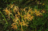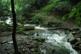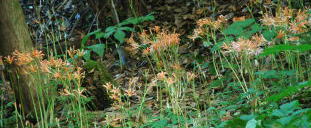 | 2006年7/20 昨日今日と土砂降りである。この雨の中チョット様子を見に行った。1週間前よりも花は増えてはいるが、まだまだだ。今回は上流部の群生地まで見に行ったところ、林床の中かなりの花茎が顔を出していた。今度の土日(22/23)はまだおすすめ出来ない。オマケに沢の水かさが増えて、長靴じゃないと向こう岸へ渉れないのだ。やっぱり見頃は月末か。 |