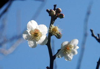 青空の下で数輪開いた白い梅の花は光を浴びて白さを輝かせていた。