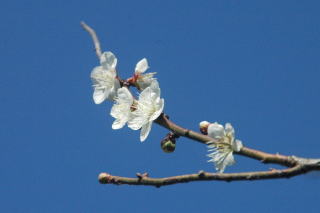 ずいぶん前から新聞には「梅一輪の暖かさ」等のキャプションを付けた梅の写真が載っていたが、工房の梅もようやく花を開いた。