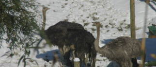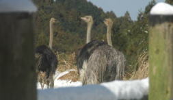 ダチョウである。白い雪の中に3匹のダチョウである。食用のために飼ってあるのだろう。ダチョウと言えば南アフリカだが、あそこは雪が降るのだろうか。羽もボソボソで心なしか寒そうであった。