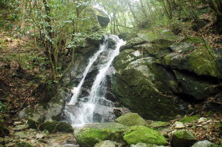 登山口からしばらくはこんな道である。右手に沢を眺めながら舗装された林道を横切り、日陰の登山路をしばらく歩くと滝が見えてきた。