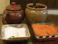 雲南料理店のテーブルサイド 醤・味噌・塩・唐辛子 |