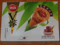 肉に飯を巻いた三角錐形のチマキ レンジでチンならこんなものか |