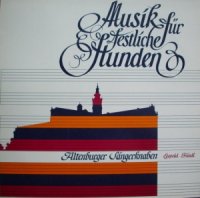 Stunden(Preiserrecords)1983/Altenburger Sangerknaben/Leitung und Orgel:Leopold Friedel Seite A 1.Kommt, ihr Freunde(H. Purcell) 2.Kyrie aus der Missa antiqua(N. Kerschbaumer) 3.Gloria aus der Missa antiqua(N. Kerschbaumer) 4.Der Herr ist mein Hirt(B. Klein) 5.Ave Maria(F.Schubert) 6.Sanctus aus der Missa antiqua(N. Kerschbaumer) 7.Agnus dei aus der Missa antiqua(N. Kerschbaumer) 8.Ave verum(W.A. Mozart) 9.Streicht die Geigen - H. Purcell Seite B 1.Die Ehre Gottes in der Natur(Beethoven) 2.Herr, unser Gott(Largo)(G.F. Handel) 3.Andante fur Flote und Orgel(Ch.W. Gluck) 4.Bitten(Beethoven) 5.All'elevatione(Domenico Zipoli) 6.Dank sei dir Herr(G.F. Handel) 「祝祭期のための音楽」とでも訳すべきか。華やかで明るい曲のセレクション。時々珍しい曲が入っている。で、83年ごろの録音らしいが、音には、60年代、70年代のウィーン少年合唱団を聞いているような、古き良き時代の柔らかさがある。かわいくはないけれど、田舎(?)にひそかに開いた、しっとりと、素朴すぎない品のある声。同じシチュエーションでいえば聖フロリアンにも似ているが、フロリアンのいぶし銀よりも明るい感じ。CD化もされていいるようだが、こういう音はレコードの方がよいかもしれない。A面一曲目はパーセルの「来たれ汝ら芸術の子ら」のドイツ語歌唱。好きな曲なので嬉しい限り。5曲目はシューベルトの「アヴェ・マリア」で、オルガンとソロで、落ち着いているけれど重過ぎない安定した歌声が自然と響いてよい感じ。同じソロが次の「サンクトス」の途中で出てくるが、「domie〜」と一際高くなるところが美しく印象的。B面1曲はベートーヴェンの「自然の中の神」。レーゲンスかテルツが歌っていたが、それ以外ではあまり聞かないので珍しい。2曲はヘンデルの「ラルゴ」。これは合唱で、アルバムの中ではちょっと重たい歌声。3曲と5曲はインストルメンタル。4曲目のベートーヴェンの「祈り」。これは私は初めて聴く。合唱でしっとりと真摯に歌われる。修道院付の聖歌隊ならではの雰囲気かな〜などど思ったりした。(by Emu) 2008/04/20 up |