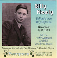 CD1 1 The Lark in Clear Air 2 Serenade 3 Cherry ripe! 4 The Fairy Tree 5 A Tragic Story 6 Five Eyes 7 Allelujah 8-13 Six Children's Songs (The Robin / The Fable / The Sad Little Bird / The Child and the Butterfly / Cradle Song / Easter Day) 14 Christopher Robin is saying his prayers 15 A Fairy Story by the Fire 16 The Child and the Twilight 17 The ninepenny fidil 18 Il bel mio foco 19 Vergin tutt' amour 20 The Birds 21 Coventry Carol 22 The First Mercy CD2 1 Ave Maria 2 Smilin' Through 3 The Sad Little Bird 4 The Lark in Clear Air 5 Hear My Prayer 6 Art thou troubled? 7 A Ballynure Ballad 8 Kitty, my love, will you marry me? 9 Here lies a most beautiful lady 10 Now daylight dies, far in the western skies 11 Give me Wings 12 How beautiful are the feet 13 I hear Spring calling 14 Mowing the Barley 15 Somewhere a voice is calling 16 Cherry, ripe! 17 Barcarolle 18 Greetings 19 Il bel mio foco 20 Roslein dreie in der Reile ビリー・ニーリー(1935〜2012)は、北アイルランドのベルファスト生まれ。1946年、セント・アン大聖堂聖歌隊に入る。 このCDには、HMV のレコードに残した録音から、BBC ラジオ放送、そしてプライベート録音に至るまで、多く収録されている。クラシックの曲から伝承曲、子供の歌など多岐にわたり、艶のある声で魅了させられる。 有名なアイルランド民謡の“The Lark in Clear Air” をボーイソプラノで聴くと何と心に迫るのか。 CD2の17、18は、アーサー・マーティンというバリトンとのデュエットである。 また、CD2の9は、1960年録音で、ローレンス・ニーリーの名でバリトンで活躍した時のコンサートの録音である。 (by northend 2018/10/8 MON up) |