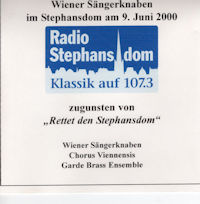 Konzert der Wiener Sängerknaben im Stephansdom am 9. Juni 2000 Radio Stephans dom Klassik auf 107.3 zugunsten von „Rettet den Stephansdom" Wiener Sängerknaben Der Wiener Chor Garde Blechbläserensemble Konzert der Wiener Sängerknaben im Stephansdom am 9. Juni 2000 1.J. S. Bach/F. Mills: Wachet auf ruft uns die Stimme Franz Schubert: DEUTSCHE MESSE 2.Wohin soll ich mich wenden 3.Ehre, Ehre 4.Noch lag die Schöpfung 5.Du gabst, o Herr 6.Heilig, heilig 7.Betrachtend Deine Huld und Güte 8.Mein Heiland, Herr und Meister 9.Herr, du hast mein Fleh'n vernommen 10.James Gallus: Heutzutage 11.Thomas Luis de Victoria: Eine Stunde 12.J. Pachelbel/W. Barnes: Kanon 13.J. Pezel: Sonata Nr. 22 14.G F. Händel: Halleluja - Amen (aus Judas Maccabäus) 15.G F. Händel: Wohin du gehst 16.Otce Nasch Vater unser (auf Kiewer Weise) Anton Bruckner: 17.Locus iste 18.Ave Maria 19.Christus factus est 20.Virga Jesse Wiener Sängerknaben - Chorus Viennensis - Garde Brass Ensemble ウィーン少年合唱団コンサート 2000年6月9日 シュテファン大聖堂にて シュテファンスドーム放送 107.3クラシックス 「シュテファン大聖堂を救え」基金のために ウィーン少年合唱団 ChorusnViennensiis 衛兵ブラスアンサンブル ウィーン少年合唱団コンサート 2000年6月9日 シュテファン大聖堂にて 1. J. S. バッハ/F. ミルズ:目覚めよ、声が呼ぶ フランツ・シューベルト:ドイツ・ミサ曲 2. どこへ向かえばいいのだろう? 3. 栄光よ、栄光よ 4. 創造はなお横たわる 5. 主よ、あなたは与え給うた 6. 聖なるかな、聖なるかな 7. あなたの恵みと慈しみを黙想する 8. 我が救い主、主、そして主人よ 9. 主よ、あなたは私の願いを聞かれました 10. ジェームズ・ガルス:今頃 11. トーマス・ルイス・デ・ビクトリア:一時間 12. J. パッヘルベル/W. バーンズ:カノン 13. J. ペツェル:ソナタ第22番 14. G. ヘンデル:ハレルヤ-アーメン(『ユダ・マカバイ記』より) 15. G. ヘンデル:あなたが行くところならどこでも 16. 主よ(キエフ様式) アントン・ブルックナー: 17. ロクス・イステ 18. アヴェ・マリア 19. キリストは事実である 20. ヴィルガ・イェッセ ウィーン少年合唱団 - コーラス・ウィーンネンシス - ガルド・ブラス・アンサンブル ブラスアンサンブルの出だしのソロの演奏部分が、なんだかおっとりしていて癒される。中盤にはブラスだけの曲があるが、親近感のわく演奏で好ましい。 ドイツミサは1982年にもリリースされているが、この盤は、LIVE故の、温かさを感じさせる。ドイツミサってしっくりくる曲だったんだと思ったのは年のせいか? 10番からWSKだけの演奏でトーンが上がる。ブラスの演奏が続くが15番は声で聴きたかった。16番からChorus Viennensis復活。演奏に広がりが出てくる。LIVEなので演奏以外の音も入って来るが、それでもなお、録り直しの効かない音の真摯さが良い。2000年というとWSKの音が又変わり始めた頃に思うがこのCDにはWSKの音があるとは思う。(by Hetsuji 2026.01.15 THU up) |