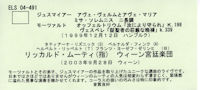 Franz Xaver Süssmayr Ave Verum Ave Maria Feierliche Messe in D-Dur Wolfgang Amadeus Mozart Offertorium „Sub Tuum Paraesidium“, KV 198 „Vesperae de Confessore“, KV 339 Tatiana Lisnic (S)/Bernarda Fink (A) Herbert Lippert (T)/Franz Josef Seling (B) Riccardo Mati Orchester der Wiener Hofmusikkapelle ジュスマイアー アヴェ・ヴェルムとアヴェ・マリアミサ・ソレムニス ニ長調 モーツァルトオッフェルトリウム「汝により守られ」 K. 198 ヴェスペレ「証聖者の荘厳な晩祷」k. 339 (1999年12月12日 ハンブルク) タティアーナ・リズニック (S) ベルナルダ・フィンク (A) ヘルベルト・リッペルト(T) フランツ・ヨーゼフ・ゼリンヒ (B) リッカルド・ムーティ(指) ウィーン宮廷楽団 (2003年9月28日 ウィーン) Tivoli の調子が悪いので TEAC で聴いているのだけれど、Choir がオーケストラと溶けて聴こえてしまう。高音楽器みたいな合唱です。 ソプラノは雌鶏系に聴こえるけれど「透明な声質」と説明されているのを見つけて、透明って何?としばし、考え込んだが判らなかった。 合唱のソプラノ部分の音がWSKならではの天に向かう声。出す声の音質によって、どのような立ち位置で何処へ向かって歌っているのか、感じさせられるのだな、と。冴え冴えとした気持ちの良い音。 ジュスマイヤーは、モーツァルトの死後に未完だった《レクイエム》の以下の部分を補筆した方で、全体の構成に違和感はない。全部、モーツァルト。 合唱はきれいなのだけれど、だからこそ、せっかくのモーツァルトのソプラノのソロ曲をボーイソプラノに歌わせないのが本当にもったいないCDだった。それにしても、ライヴCDって、けっこう存在しているんだなー。(by Hetsuji 2026.01.21 WED up) |