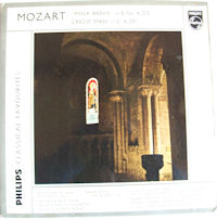1980年8月頃にウィーン少年合唱団名盤としてレコード会社が紹介しています。 アレルヤ、アヴェ・ヴェルム・コルプス〜ウィーン少年合唱団 モーツァルトをうたう (PHILIPS15PC-127) 1964年3月ウィーン、1963年4月(K.165)録音。 指揮:ヘルマン・フルトモーザ(SIDE 1-1) 指揮:フェルディナンド・グロスマン(SIDE 1-2,3 SIDE 2) SIDE :1 1.モテット:エクスルターテ・イゥビラーテK.165 2.オッヘェルトリウム・デ・テンポーレ:主のお憐れみをK.222 3.聖母マリアのためのオッフェルトリウム:うるわしの創造主なる神の御母K.277 SIDE :2 1.ヴェニ・サンクテ・スピリトゥスK.47 2.洗者聖ヨハネの祝日のためのオッフェルトリウムK.72 3.レジナ・チェリK.276 4.聖母マリアの祝日のためのグランドゥアーレ:サンクタ・マリア・マーテル・ディK.273 5.聖体の祝日のためのオッフェルトリウム:来たれ、もろもろの民K.260 6.モテット:アヴェ・ヴェルム・コルプスK.618 1人のウィーン少年合唱団員=ソプラノ(SIDE 1-1) 、2人のウィーン少年合唱団員=ソプラノとアルト、ルドルフ・レッシュ=テノール、アロイス・ブッフボイアー=バス(SIDE 1-2,3 SIDE 2) |